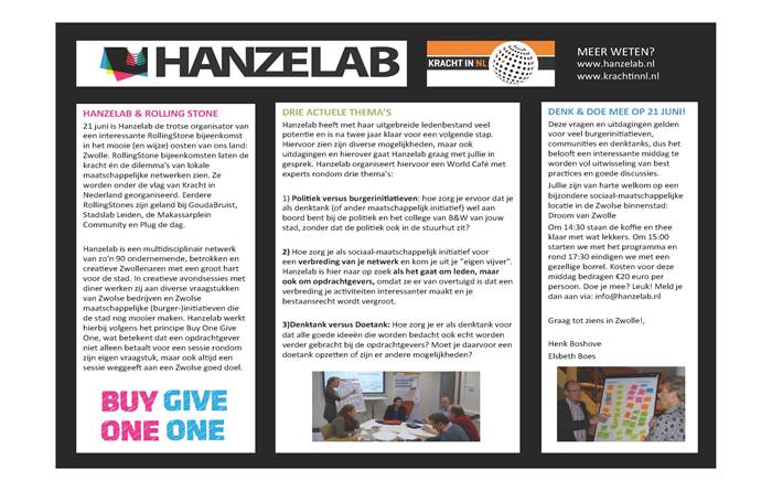 http://hanzelab.nl/uploads/attachments/original/Uitnodiging_Rolling_Stone_21_juni.pdfHet sociaal-maatschappelijk netwerk Hanzelab bestaat uit zo’n 90 creatieve en betrokken Zwollenaren. Zij gaan aan de slag in opdracht van publieke en maatschappelijke organisaties en verleiden hen zich aan initiatieven en goede doelen in de stad te verbinden. Hun motto is: ‘Buy one, give one’.
